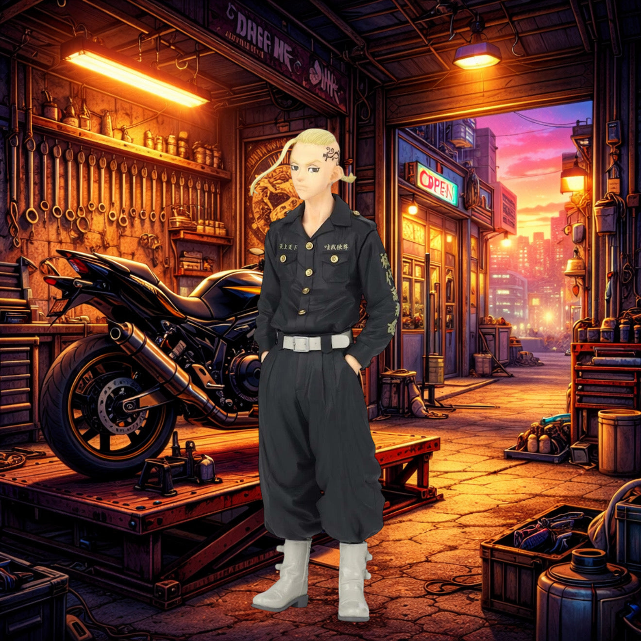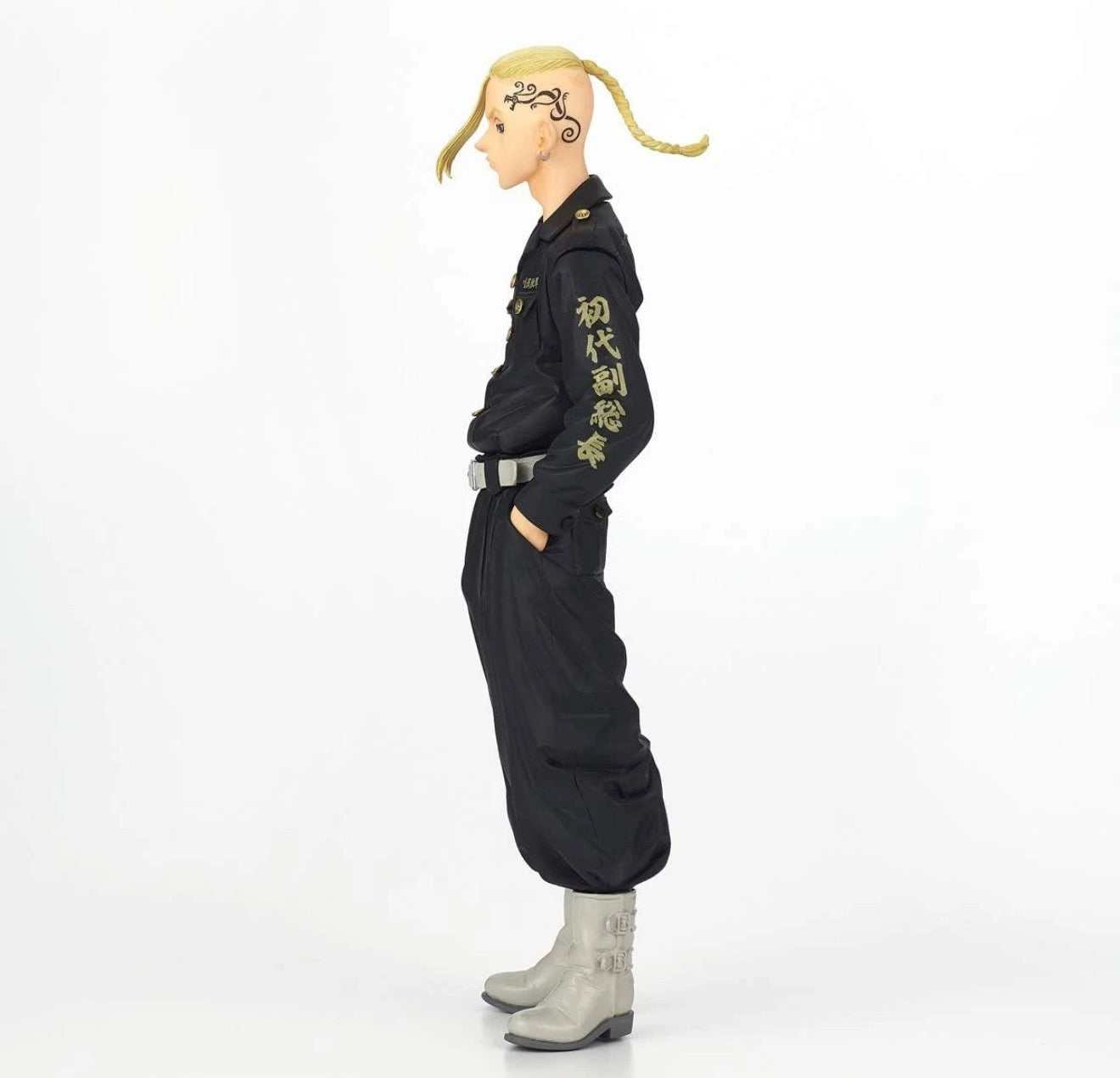 La figure rappresenta Draken nella sua iconica uniforme nera con dettagli dorati, posa sicura e sguardo determinato. Il celebre tatuaggio laterale e l’acconciatura bionda sono riprodotti fedelmente per offrire una resa realistica e carismatica.
